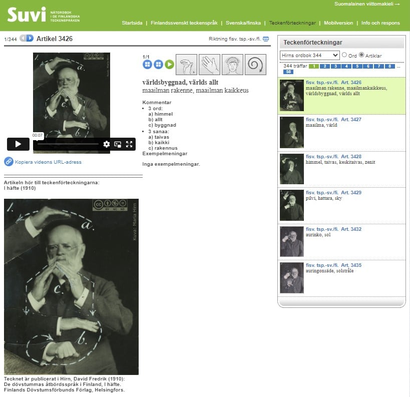Hirns ordbok tar med tecken från hundra år sedan till idag. Tecken i Hirns ordbok har digitaliserats och publicerats i Suvi nätordbok i de finlandska teckenspråken.